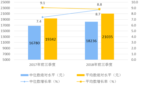 前三季度,全國居民人均可支配收入中位數18236元,增長8.7%,中位數是平均數的86.7%。其中,城鎮居民人均可支配收入中位數27227元,增長7.4%,是平均數的92.0%;農村居民人均可支配收入中位數9248元,增長9.2%,是平均數的86.9%。