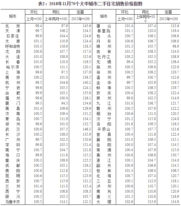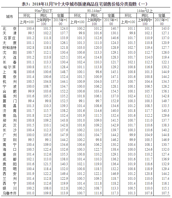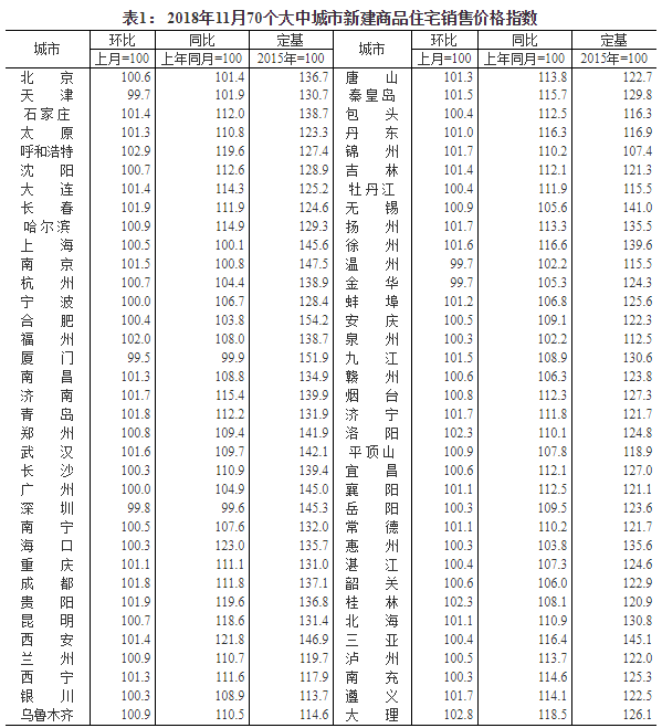 2018年11月份70個大中城市商品住宅銷售價格變動情況