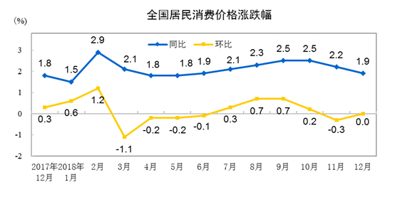 2018年12月份,全國居民消費價格同比上漲1.9%。其中,城市上漲1.9%,農村上漲1.9%;食品價格上漲2.5%,非食品價格上漲1.7%;消費品價格上漲1.7%,服務價格上漲2.1%。