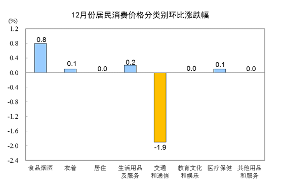 12月份,全國居民消費價格環比與上月持平。其中,城市和農村均與上月持平;食品價格上漲1.1%,非食品價格下降0.2%;消費品和服務價格均與上月持平。