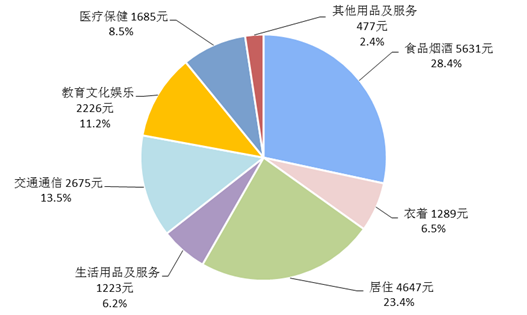 全年全國居民人均食品煙酒消費支出5631元,比上年增長4.8%,占人均消費支出的比重為28.4%;人均衣著消費支出1289元,增長4.1%,占人均消費支出的比重為6.5%;人均居住消費支出4647元,增長13.1%,占人均消費支出的比重為23.4%;人均生活用品及服務消費支出1223元,增長9.1%,占人均消費支出的比重為6.2%;人均交通通信消費支出2675元,增長7.1%,占人均消費支出的比重為13.5%;人均教育文化娛樂消費支出2226元,增長6.7%,占人均消費支出的比重為11.2%;人均醫療保健消費支出1685元,增長16.1%,占人均消費支出的比重為8.5%;人均其他用品及服務消費支出477元,增長6.8%,占人均消費支出的比重為2.4%。