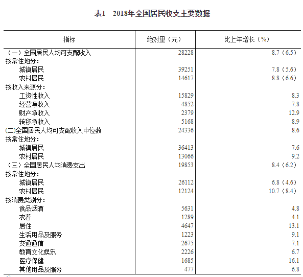 2018年,全國居民人均可支配收入28228元,比上年名義增長8.7%,扣除價格因素,實際增長6.5%。其中,城鎮居民人均可支配收入39251元,增長(以下如無特別說明,均為同比名義增長)7.8%,扣除價格因素,實際增長5.6%;農村居民人均可支配收入14617元,增長8.8%,扣除價格因素,實際增長6.6%。