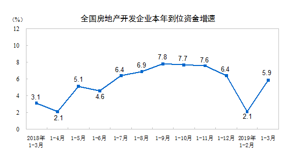 1-3月份,房地產開發企業到位資金38948億元,同比增長5.9%,增速比1-2月份提高3.8個百分點。其中,國內貸款7134億元,增長2.5%;利用外資33億元,增長1.1倍;自籌資金11795億元,增長3.0%;定金及預收款12303億元,增長10.5%;個人按揭貸款5645億元,增長9.4%。