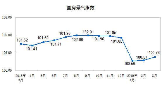 3月份,房地產開發景氣指數(簡稱“國房景氣指數”)為100.78,比2018年2月份回落0.21點。