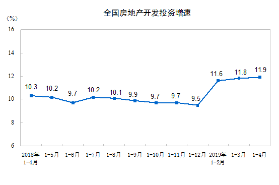 2019年1—4月份,全國房地產(chǎn)開發(fā)投資34217億元,同比增長11.9%,增速比1—3月份提高0.1個(gè)百分點(diǎn)。其中,住宅投資24925億元,增長16.8%,增速回落0.5個(gè)百分點(diǎn)。住宅投資占房地產(chǎn)開發(fā)投資的比重為72.8%。