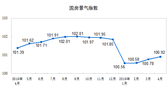 4月份,房地產(chǎn)開發(fā)景氣指數(shù)(簡稱“國房景氣指數(shù)”)為100.92,比3月份提高0.14點(diǎn)。