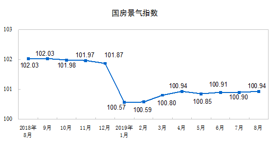 8月份,房地產開發景氣指數(簡稱“國房景氣指數”)為100.94,比7月份提高0.04點。