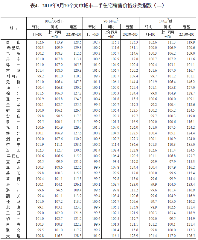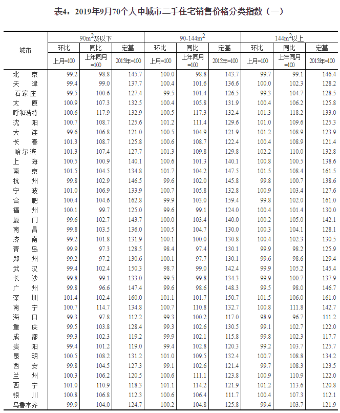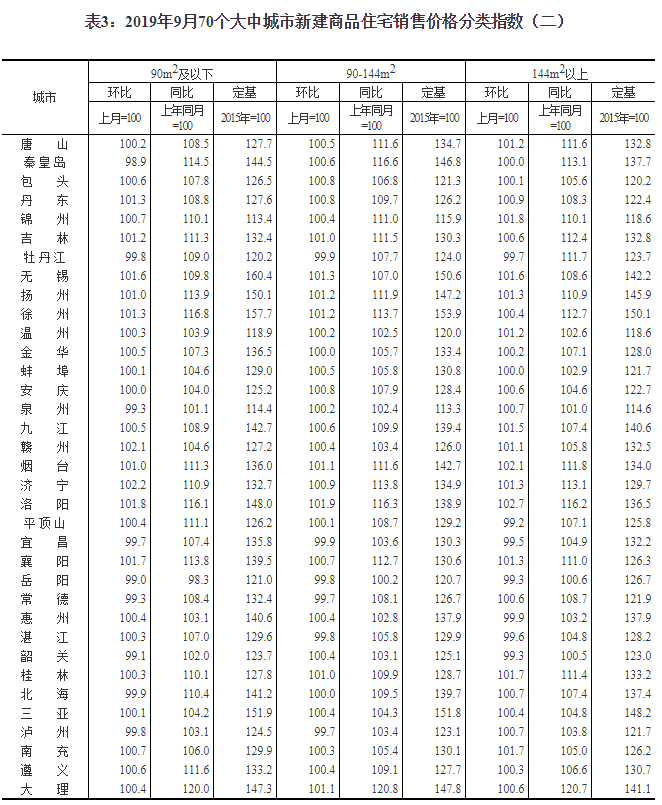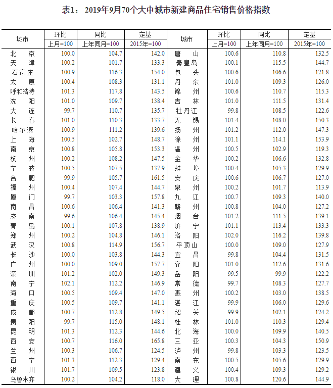 2019年9月份70個大中城市商品住宅銷售價格變動情況