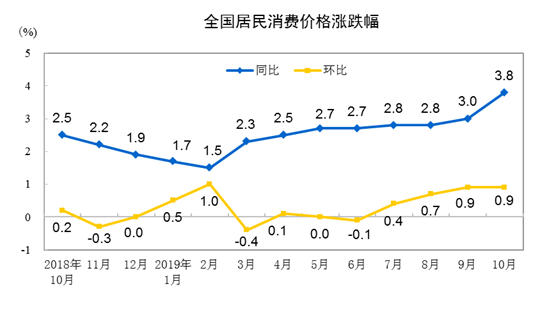 2019年10月份,全國居民消費價格同比上漲3.8%。其中,城市上漲3.5%,農村上漲4.6%;食品價格上漲15.5%,非食品價格上漲0.9%;消費品價格上漲5.2%,服務價格上漲1.4%。1--—10月平均,全國居民消費價格比去年同期上漲2.6%。