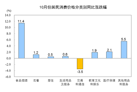 10月份,食品煙酒類價格同比上漲11.4%,影響CPI(居民消費價格指數)上漲約3.37個百分點。食品中,畜肉類價格上漲66.8%,影響CPI上漲約2.92個百分點,其中豬肉價格上漲101.3%,影響CPI上漲約2.43個百分點;禽肉類價格上漲17.3%,影響CPI上漲約0.21個百分點;雞蛋價格上漲12.3%,影響CPI上漲約0.07個百分點;水產品價格上漲2.7%,影響CPI上漲約0.05個百分點;糧食價格上漲0.5%,影響CPI上漲約0.01個百分點;鮮菜價格下降10.2%,影響CPI下降約0.27個百分點;鮮果價格下降0.3%,影響CPI下降約0.01個百分點。