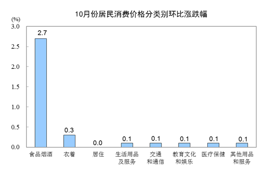 10月份,全國居民消費價格環比上漲0.9%。其中,城市上漲0.8%,農村上漲1.2%;食品價格上漲3.6%,非食品價格上漲0.2%;消費品價格上漲1.4%,服務價格持平。