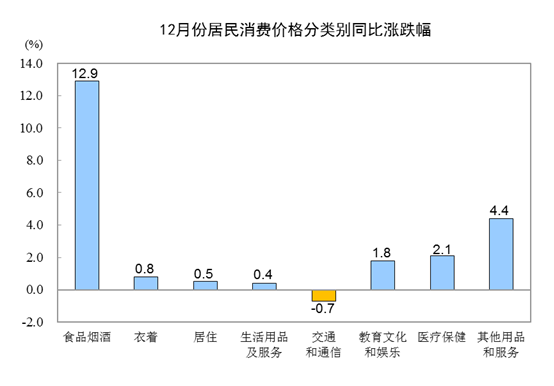 12月份,食品煙酒類價格同比上漲12.9%,影響CPI(居民消費價格指數)上漲約3.82個百分點。食品中,畜肉類價格上漲66.4%,影響CPI上漲約2.94個百分點,其中豬肉價格上漲97.0%,影響CPI上漲約2.34個百分點;鮮菜價格上漲10.8%,影響CPI上漲約0.26個百分點;蛋類價格上漲6.2%,影響CPI上漲約0.04個百分點;水產品價格上漲1.3%,影響CPI上漲約0.02個百分點;糧食價格上漲0.6%,影響CPI上漲約0.01個百分點;鮮果價格下降8.0%,影響CPI下降約0.15個百分點。