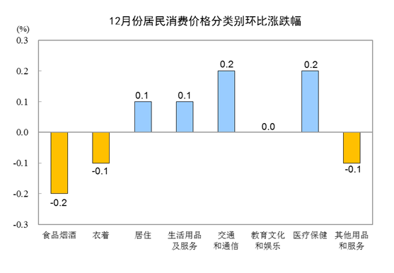 12月份,全國居民消費價格環比持平。其中,城市持平,農村下降0.1%;食品價格下降0.4%,非食品價格上漲0.1%;消費品和服務價格均持平。