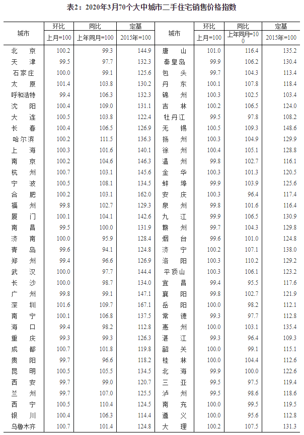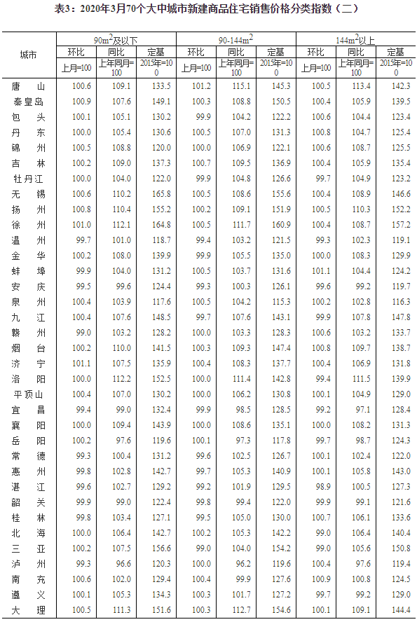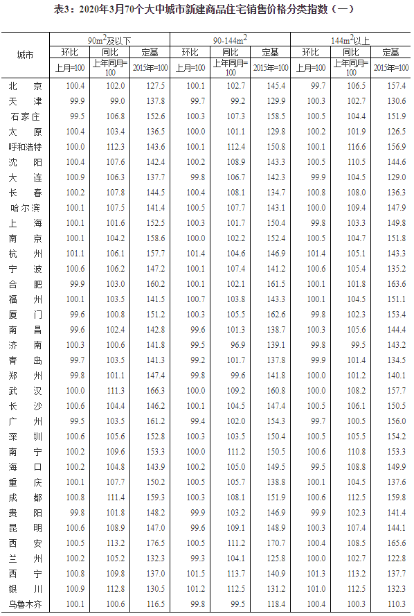 2020年3月份70個大中城市商品住宅銷售價格變動情況
