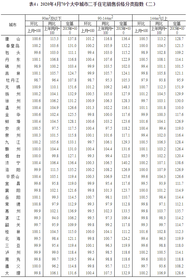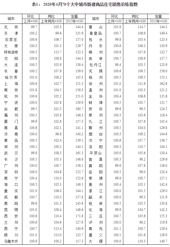 2020年4月份70個大中城市商品住宅銷售價格變動情況