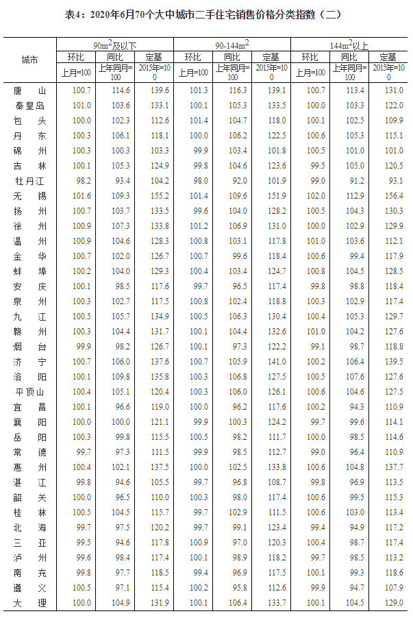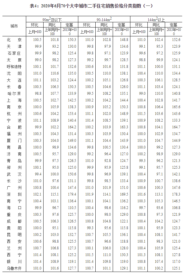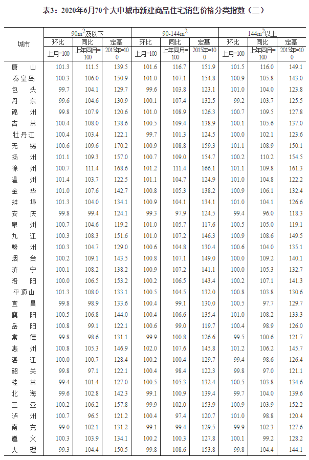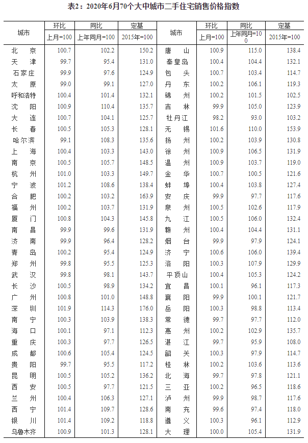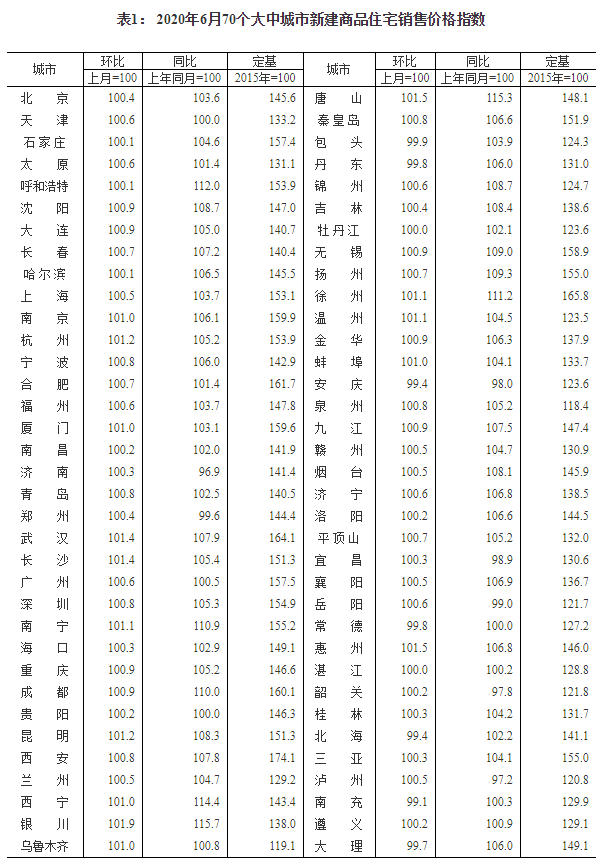 2020年6月份70個大中城市商品住宅銷售價格變動情況