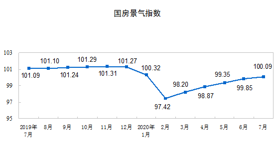 7月份,房地產開發景氣指數(簡稱“國房景氣指數”)為100.09,比6月份提高0.24點。