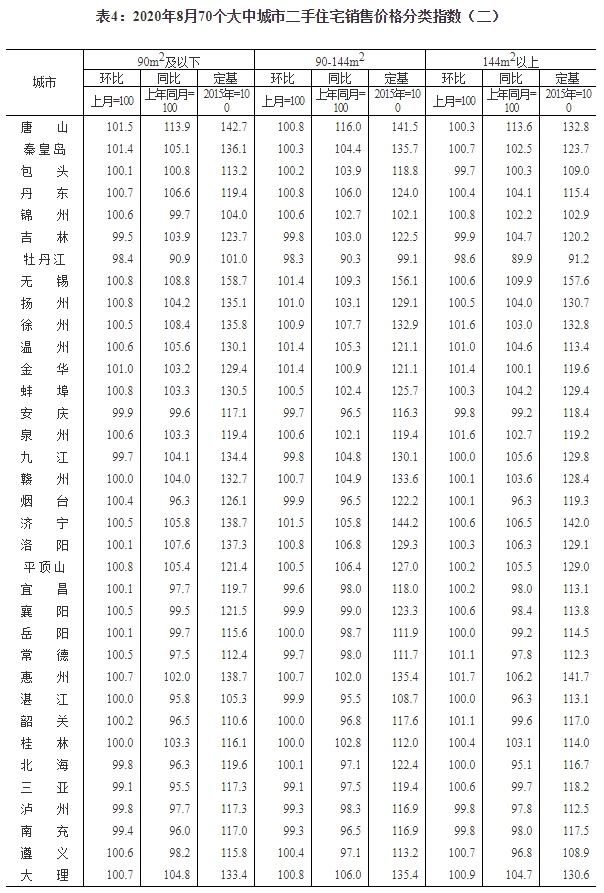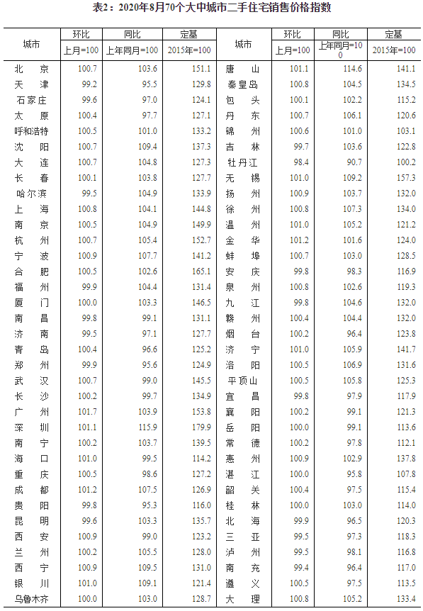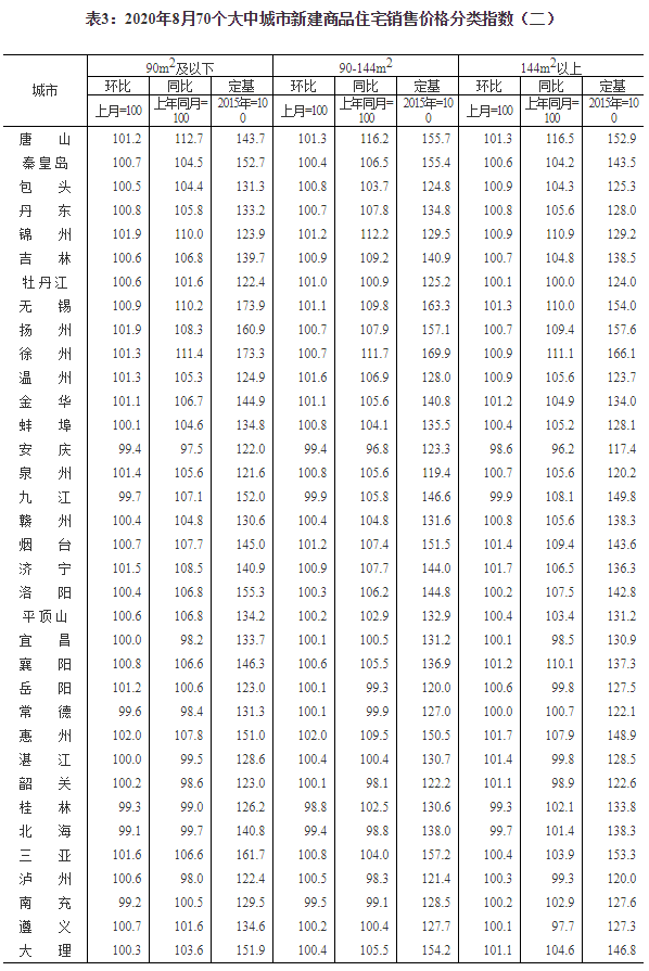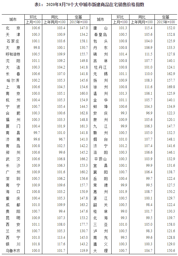 2020年8月份70個大中城市商品住宅銷售價格變動情況