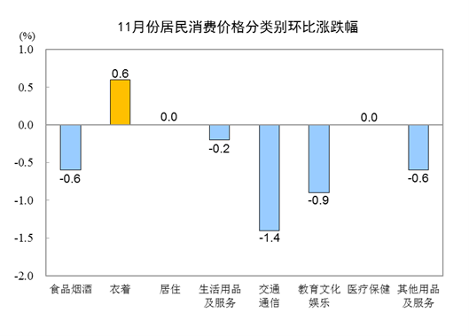 11月份,全國居民消費價格環比下降0.5%。其中,城市下降0.5%,農村下降0.4%;食品價格下降0.9%,非食品價格下降0.4%;消費品價格下降0.5%,服務價格下降0.4%。